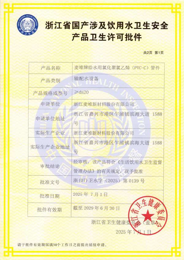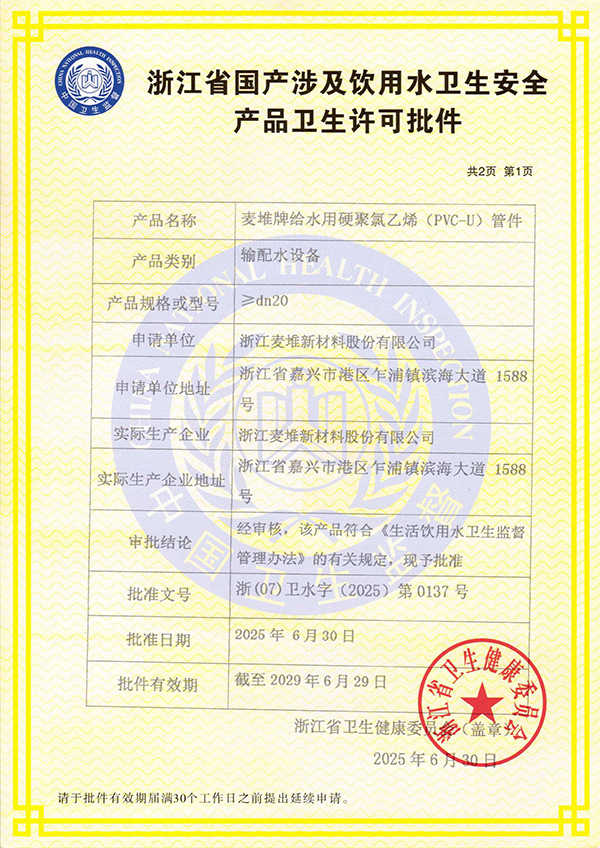 0139卫批许可-麦堆牌给水用氯化聚氯乙烯(PVC)