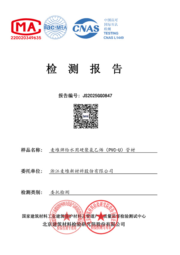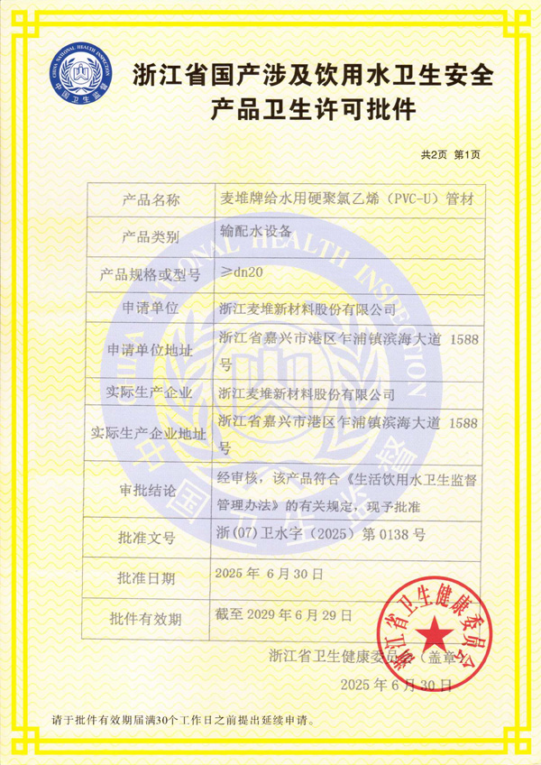 0138卫批许可-麦堆牌给水用硬聚氯乙烯(PVC-U)
