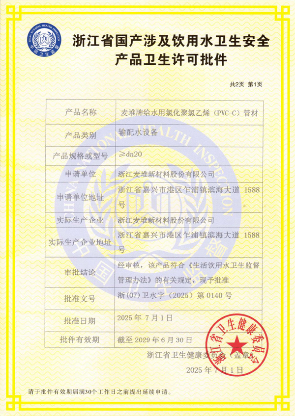 0140卫批许可-麦堆牌给水用氯化聚氯乙烯(PVC)